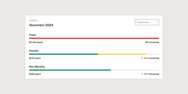 Monarch makes flex budgeting easy by looking at your income and transactions and giving you a view of your budget divided into three high-level buckets: Fixed, Non-Monthly, and Flexible. Your flex number is what shows up as the top-line in your Flexible Expenses view. Monarch shows you exactly how you’re tracking toward your flex number for the month, so you can easily make spending decisions.